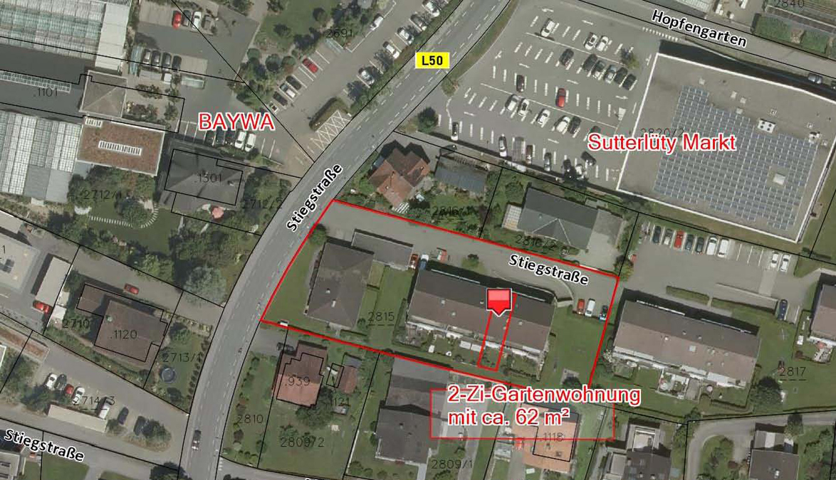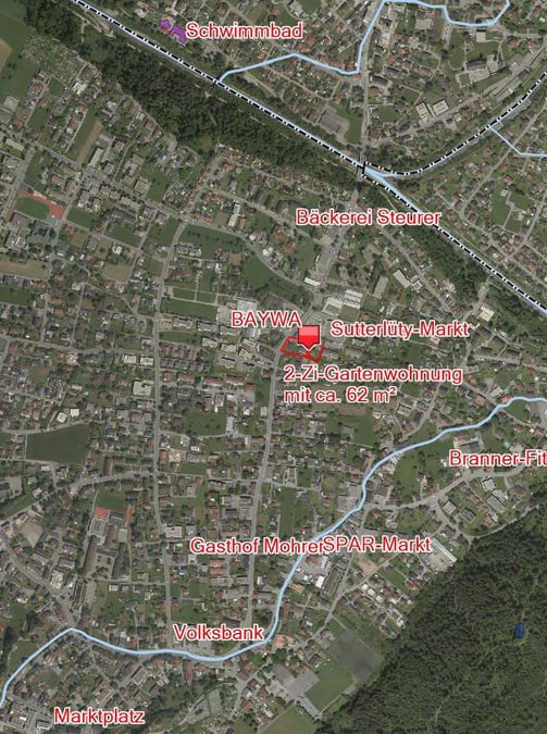 Die Einkaufsmärkte von Sutterlüty und BAYWA befinden sich ganz in der Nähe.